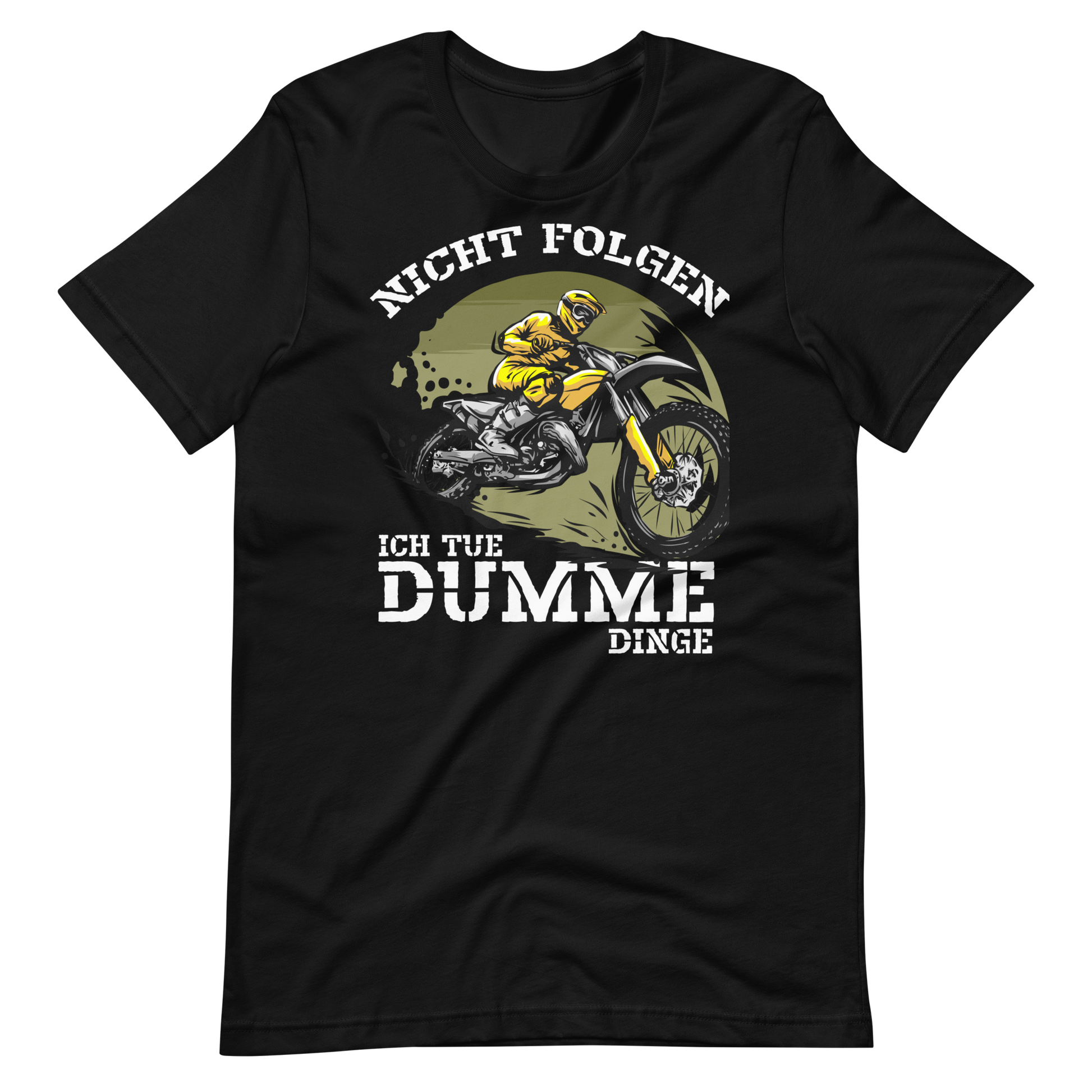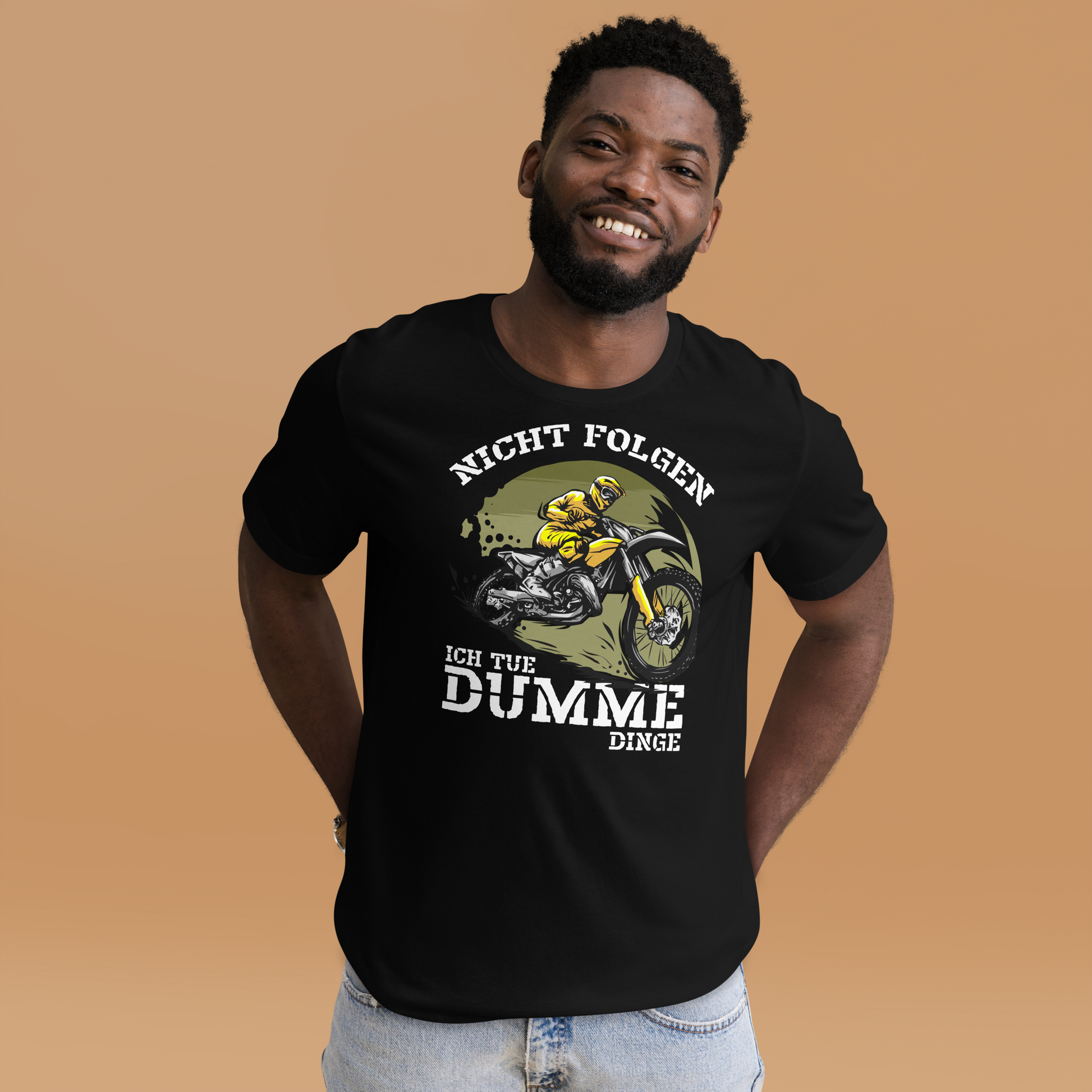 Mit dem Motocross T-Shirt kannst du deine rebellische Seite zeigen und dich von der Masse abheben! Unser hochwertiges Shirt mit dem aufmunternden Spruch "Nicht folgen! Beim Motocross tue ich dumme Dinge" ist perfekt für alle, die den Nervenkitzel des Motocross lieben.